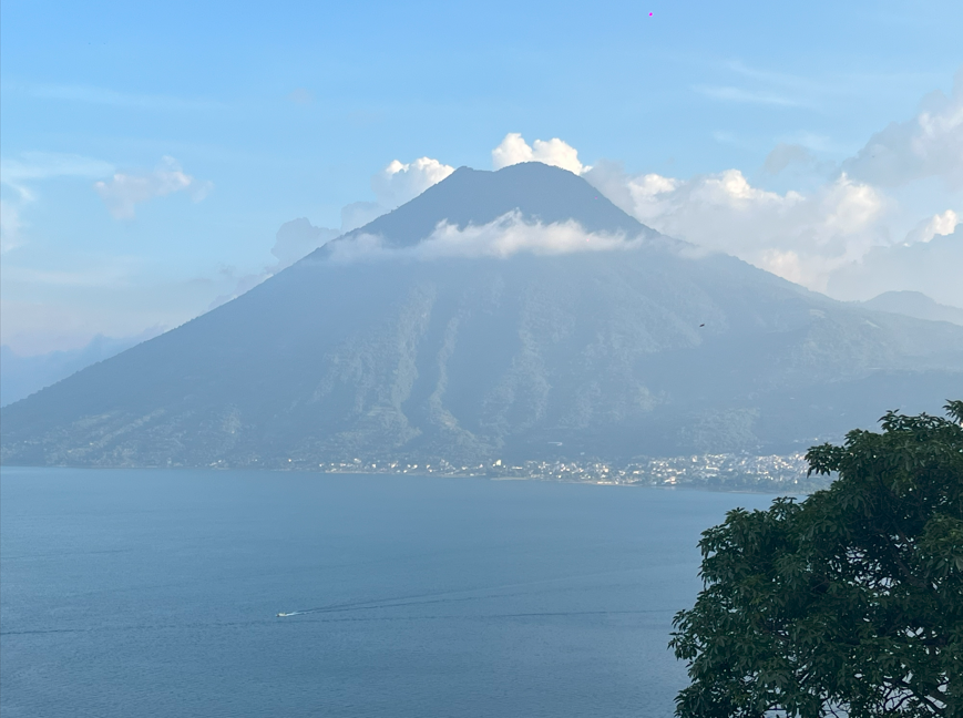 Vaar over het schilderachtige Atitlán-meer, omringd door vulkanen.